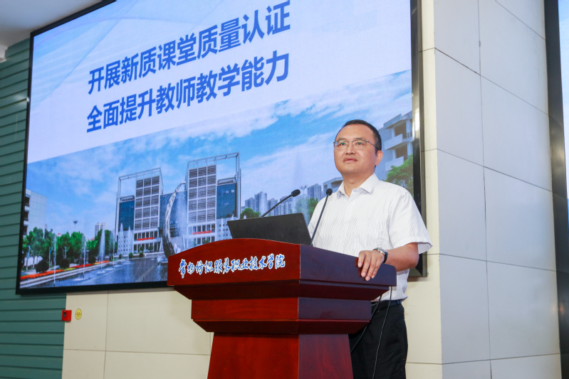 随后党委委员、副校长马昀详细解读了《新质课堂质量认证实施方案》,为与会人员描绘了一幅清晰的实施蓝图。他从认证目标、认证标准、认证流程、暑期培训安排等方面进行了全面阐述,特别强调了新质课堂的核心在于“新”,即教学理念新、教学内容新、教学方法新、教学评价新。马昀还透露,暑期将举办一系列针对性强、实用性高的培训活动,助力教师提升教学能力,为认证工作做好充分准备。